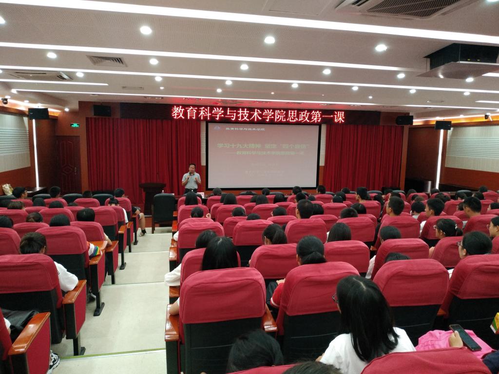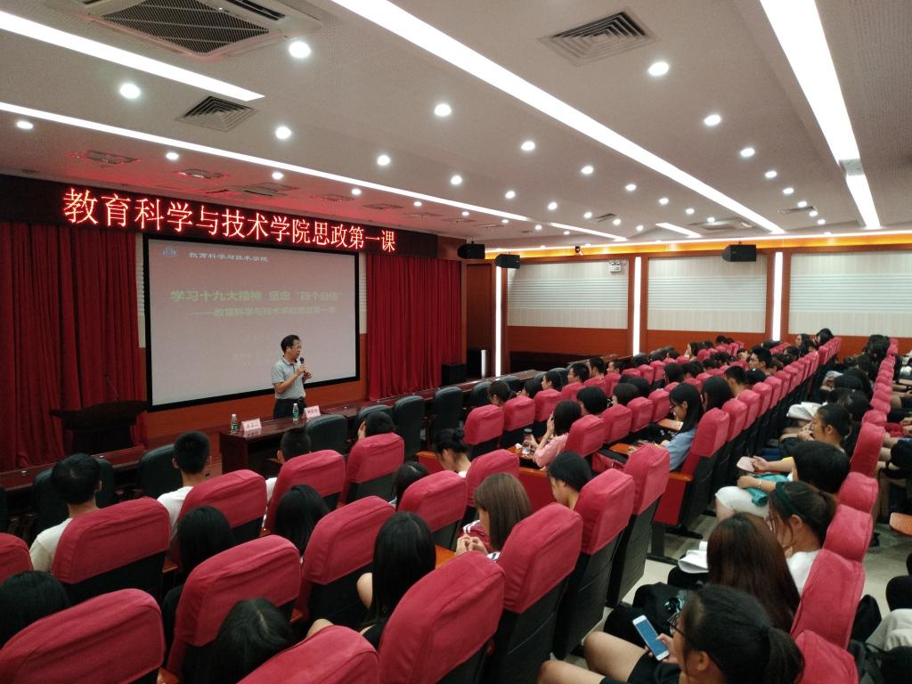 为全面深入贯彻学习习近平新时代中国特色社会主义思想和党的十九大精神,9月30日12时,教育科学与技术学院党委在白云校区第三教学楼104报告厅举行了以“学习十九大精神,坚定四个自信”为主题的思政学习第一课。出席本次思想政治教育第一课的有学院党委书记林启词、辅导员吴晨阳老师以及来自教育科学与技术学院18级教育技术师范3班、数字媒体技术1班、学前教育2班、应用心理1班和2班的全体同学。