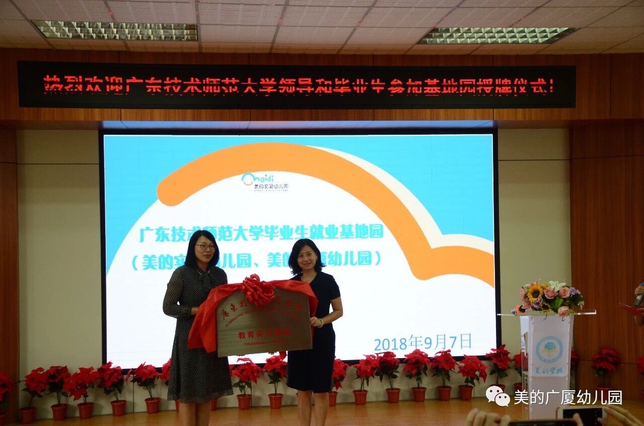 为了更好地建设与发展我校的学前教育专业,培养德才兼备的高素质学前教育应用型人才,9月7日,广东技术师范学院与美的教育(美的实验幼儿园、美的广厦幼儿园)在美的教育学术报告厅,举行了简短而隆重的“教育实习基地建设合作协议”签署及授牌仪式。我校教育科学与技术学院学前教育系主任孙文云副教授、美的教育梁结银董事长及管理团队、美的实验及美的广厦幼儿园行政领导班子,幼儿园教师代表及我校的实习老师出席了本次仪式。