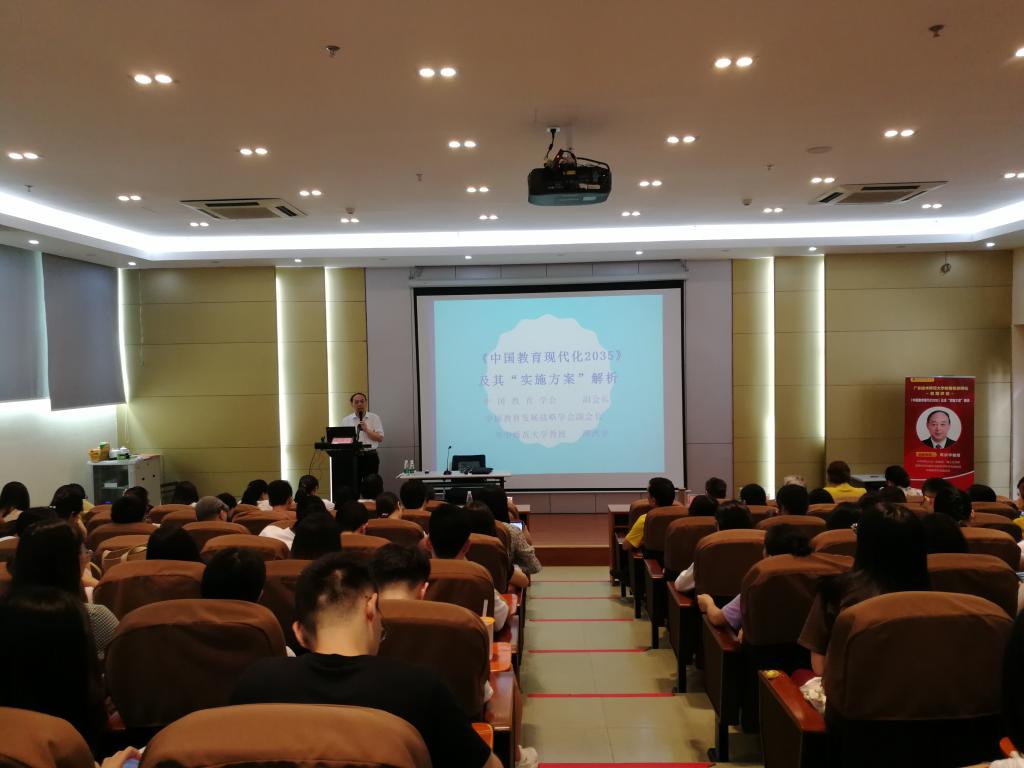 周洪宇以“《中国教育现代化2035》及其‘实施方案’解析”为主题做了学术报告。周洪宇教授认为,《中国教育现代化2035》颁布的历史背景深远,其绘就了中国教育现代化的宏伟蓝图,“既巩固了现有的教育成果,也满足未来广大人民群众不断提升的教育需求”;《中国教育现代化2035》作为引领未来中国教育现代化的纲领性文件,对未来中国教育改革与发展意义重大;呼吁“教育界要深入学习贯彻《中国教育现代化2035》及其‘实施方案’”。在互动环节,师生们与周洪宇教授探讨了“国家大力发展职业教育”这一话题。周洪宇的报告高屋建瓴,既有对规划背景意义的深刻分析,也有对规划目标、任务和举措的精准解读,扩大了师生的视野,深化了师生对规划的认识和领悟。