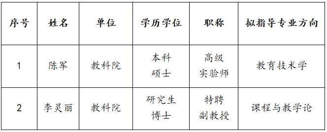 根据《TapTap,TapTap点点研究生导师遴选办法》以及《教育科学与技术学院学术学位研究生导师遴选工作实施细则》,经个人申请、学院审核和学院学位评定分委员会审议表决,现将TapTap点点2020年学术学位硕士研究生拟新增导师名单公示如下: