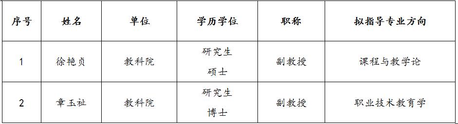 根据《TapTap,TapTap点点学术学位研究生导师遴选办法》以及《教育科学与技术学院学术学位研究生导师遴选工作实施细则》,经个人申请、学院审核和学院学位评定分委员会审议表决,现将TapTap点点2019年学术学位硕士研究生拟新增导师名单公示如下: