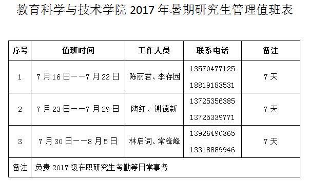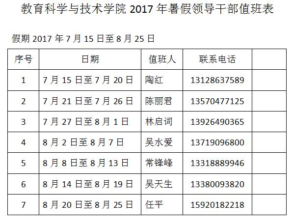 (一)教师放假时间为2017年7月15日至8月24日,8月25日(星期五)回单位报到,教科院班子成员上午8:30开会,全体教工9:50在校本部实验楼108集中开会。8月28日(星期一)开始上课。