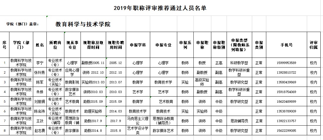 广东技术师范学院教育科学与技术学院职称评审工作小组初步资格审核,李宁等8名同志将推荐至学校职称评审委员会进行评审,根据学校关于评前公示的要求,现予公示。公示时间从2019年10月18日至10月24日止。若对评审推荐人员有异议,请电话或书面向下列有关部门反映。反映情况时要自报或签署真实姓名,要有具体事实;不报或不真实姓名的,以及不提供具体事实材料的,一律不予受理。情况反映的部门,电话和地址:学院党政办公室联系电话(传真):38256181;纸质材料公开展示及联系地址:校本部工业中心718室