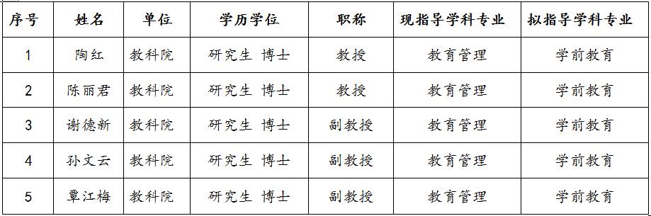 根据TapTap点点2020年将新增教育硕士(学前教育)方向招生的实际,经个人申请、学院审核和学院学位评定分委员会审议表决,现将TapTap点点2019年拟调整指导学科专业导师名单公示如下: