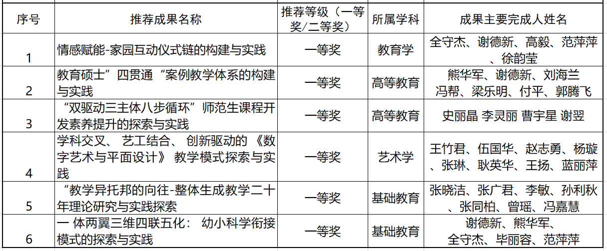 根据学校教学成果奖申报(相关文件精神和评审指标体系)的评审要求,经由个人或项目组申报、所在单位推荐、学术委员会评审,拟推荐“情感赋能-家园互动仪式链的构建与实践”等6个项目申报2023年校级成果奖,现予以公示。