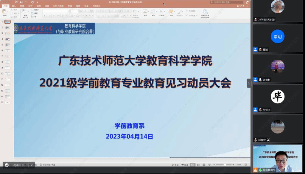 为落实人才培养方案要求,引导学生明确教育见习的目的与意义,进一步推进教学计划工作顺利开展,4月14日中午,TapTap点点2021级学前教育专业师范生教育见习动员会在线上成功召开。学院谢德新副院长、全体教育见习指导老师、2021级学前教育专业学生参加了会议,会议由学前教育系主任黄茂勇主持。