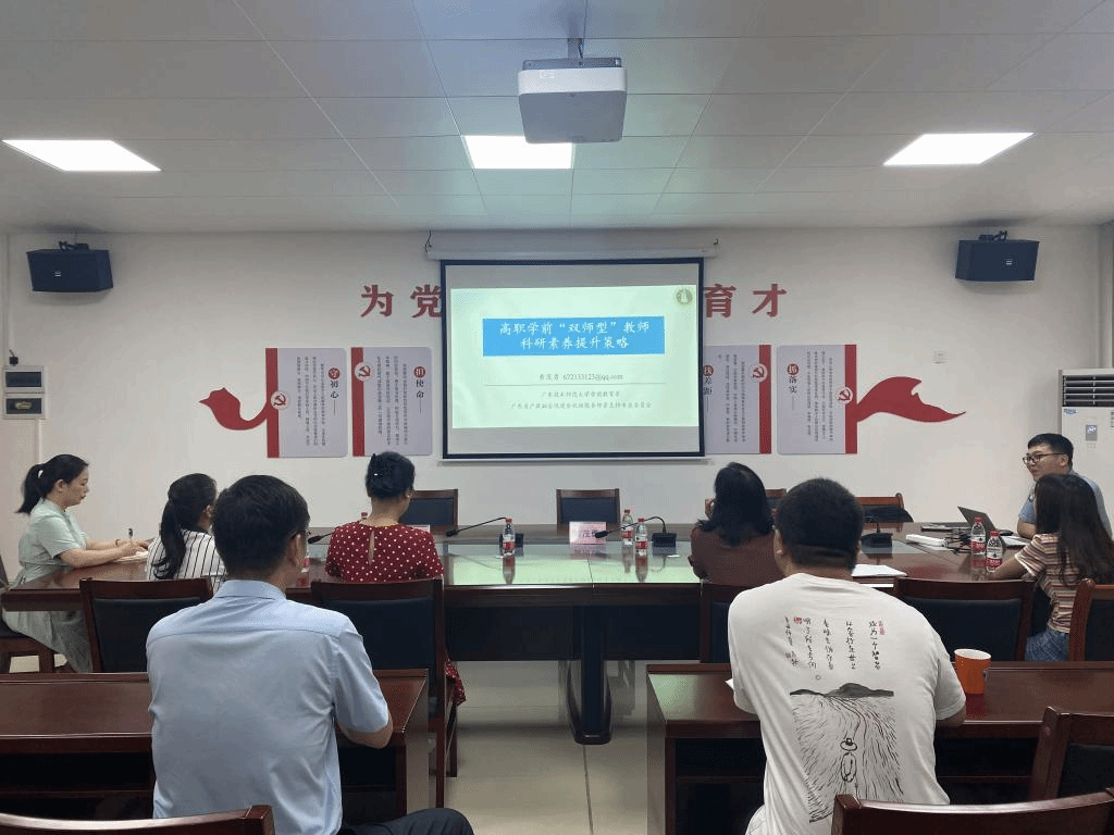 6月19日下午,黄茂勇赴河源职业技术学院开展“送教上门”专题讲座,河源职业技术学院院长杜伟祥、河源职业技术学院副院长李雄以及学前教育、早期教育相关教师参与了本次活动。讲座围绕“高职院校的科研定位”、“高职‘双师型’教师队伍的科研定位”、“高职学前‘双师型’教师科研能力发展”和“智能时代高职教师发展路径转型”四个层面进行专题座谈。通过本次“送教上门”专题培训活动,参与的教师纷纷表示感触颇多,受益匪浅,也表示要积极把学到的理论运用于接下来的科研工作中,不断提升自身的科研能力及素养。