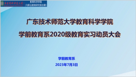 2023年7月3日星期一下午,学前教育系举行2020级师范生教育实习动员大会。学院副院长谢德新、系主任黄茂勇、专业负责人徐韵莹、学前教育系全体专任教师及2020级全体学生参加了会议。