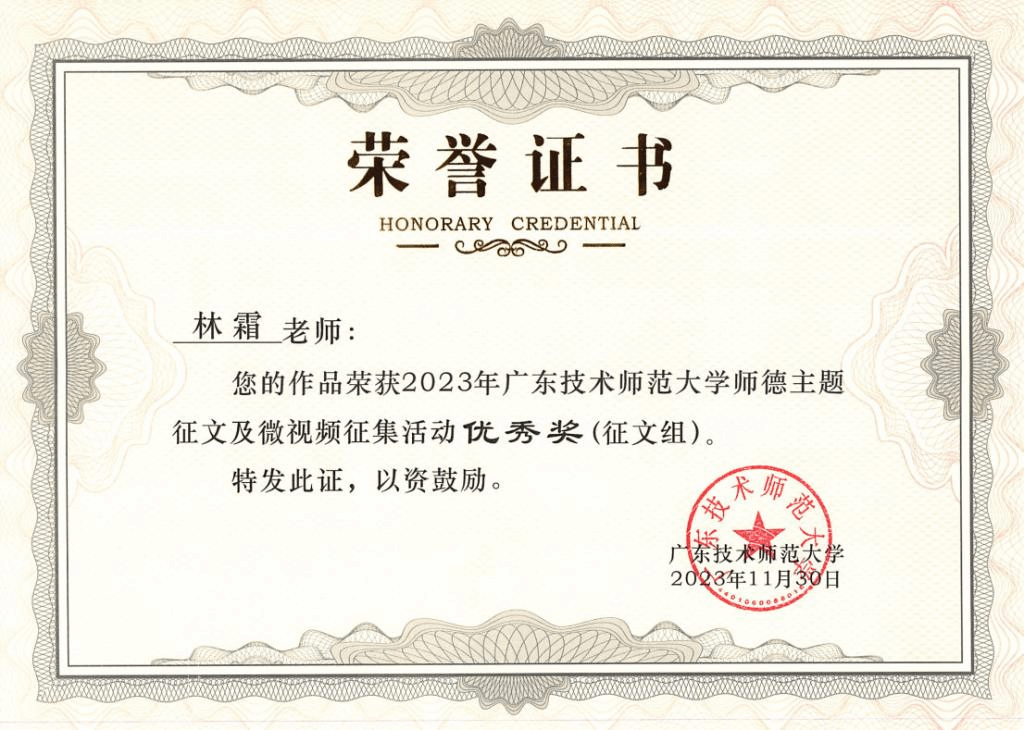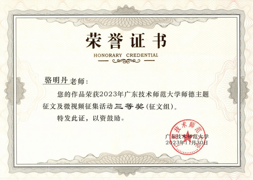 近日,学校公布了2023年围绕“躬耕教坛 强国有我”师德主题征文及微视频征集活动评选结果,TapTap点点取得可喜成绩。全校29个二级单位的投稿作品88件(征文71篇、微视频17个),TapTap点点报送的《心之所向,行之所往》(作者:骆明丹老师)荣获征文三等奖,《新时代,新担当》(作者:林霜老师)荣获征文优秀奖。《“双带头人”教师党支部书记工作室建设工作》(作者:陈名祎老师、赵玉教授)荣获微视频优秀奖。