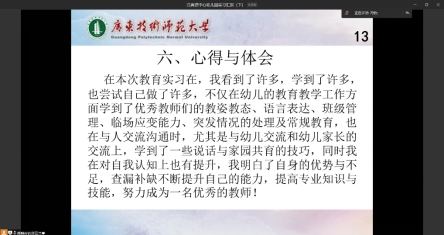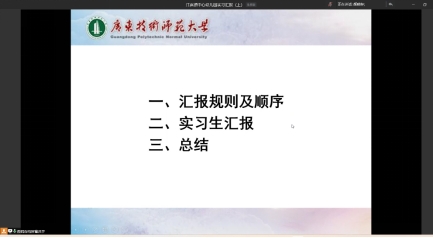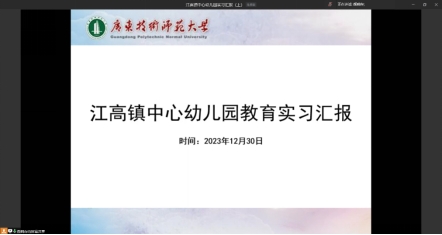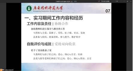 在实习生汇报环节,18名实习生分别分享了在江高镇中心幼儿园的实习经历,大家表示,在江高镇中心幼儿园的实习生活中,从最初的茫然到逐渐成长,发现了自己身上存在的不足,历尽了一些困难与挑战,也收获了许多成果和感悟。
