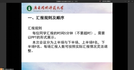 此次汇报会议共分为三个环节,分别为汇报规则及顺序、实习生汇报以及总结三部分。在第一部分中,介绍了本次汇报会议的相关规则及顺序。
