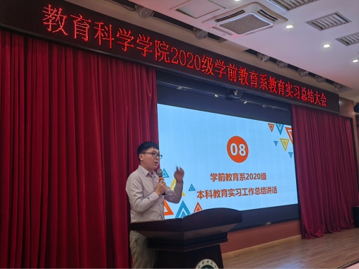 最后,由学前教育系主任黄茂勇主任发表了教育实习工作总结讲话。黄老师回顾了本次教育实习的过程,指出经过实习,每位同学的综合素质都得到了不同程度的提升。同时黄主任强调,实习生们应将自己的实习成果转化成个人经验,明确教师的身份,不断提升专业技能。此外,黄主任还特别指出,我们的教育实习工作得到实习单位的高度评价,这充分展示了我校学前教育系在人才培养方面的显著成果。
