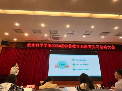首先,经各指导老师评选,脱颖而出的11位校级优秀实习生代表候选人,为我们呈现了一场精彩的汇报展示。他们向在场的师生分享了自己在实习中的所见所闻、收获与反思。大家纷纷表示,在实习的过程中,大家体验了从学生向教师的身份转变,锻炼了自身的教育教学技能,掌握了很多科学有效的班级管理常规方法等。总体而言,本次教育实习对每位同学的成长和职业规划产生了深远的教育意义和积极影响。