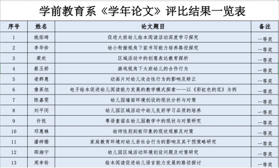 根据《学前教育系关于开展2021级本科学年论文工作的通知》,经过激烈的角逐,学前教育系学年论文评比结果于近日揭晓,共有64名学生获得奖项,其中一等奖13人,二等奖21人,三等奖30人。