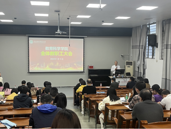 随后,学院领导对自己分管的相关工作进行年度总结并做了2024年相关工作部署。吴水爱副书记对学生工作,研究生、本科生相关工作做了总结并对来年工作做了部署。谢德新副院长就本科教学事务、专业建设、新专业招生、学前教育卓越班等相关工作做了总结。刘海兰副院长总结了学院去年研究生工作的成绩,提醒大家继续做好研究生教学中日常工作,注重提高研究生培养质量,并强调下学期研究生答辩相关事宜。冯帮副院长对科研、实验室建设、培训、会议组织、社会服务等工作做了总结汇报并倡导大家进行有组织的科研,鼓励全员教师继续积极申报各类课题。