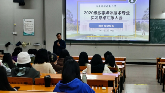 最后伍国华老师对此次2020级数字媒体技术专业实习总结汇报大会进行总结。不管是教育实习还是专业实习,都是全面检验同学们大学期间所学知识成效的一次很好的机会。经过实习,同学们的专业技能和综合素质都得到了提升,较为完美的完成此次实习任务,获得了用人单位的好评,显示了数字媒体技术专业在人才培养方面能够紧跟时代发展要求的培养效果。