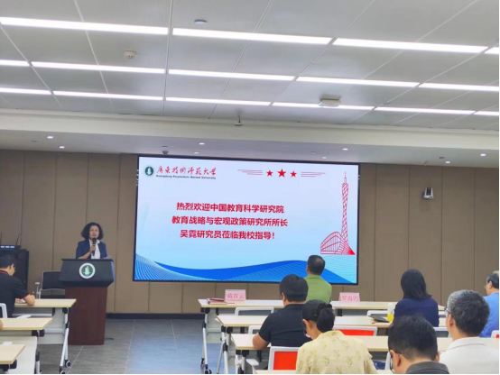 为深入贯彻落实省委省政府实施的“1310”工程和“百千万工程”,进一步推进我校与河源市的教育帮扶工作,2024年10月12日,我校邀请到中国教育科学研究院教育战略与宏观政策研究所所长吴霓做了题为“教育帮扶的国家战略与典型经验”的专题报告。会议由戴青云校长主持,罗海鸥特聘研究员及各学院教师80余人参加了会议。