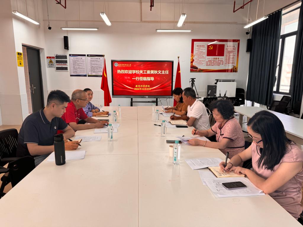 在听取学院的汇报后,学校关工委主任黄秋文对学院关工委工作表示肯定,并对学院关工委后续工作提出了建设性意见。他希望,一是要充分认识关工委工作的重要性,进一步学习贯彻落实中办、国办46号文件、部党组34号文件和学校文件精神,准确把握党中央对关心下一代工作的新要求,做好关心下一代工作的理论研究与阐释;二是要始终围绕立德树人中心工作开展,明确关工委定位和主要工作任务,深入学习全国教育大会精神,确保关工委工作在服务大学生思想政治教育的政治方向正确;三是要主动作为,结合学院实际情况打造品牌项目,突出“五老”特色和亮点,加强典型宣传,发动更多师生参与关工委的工作当中,助力学院博士点建设和关工委工作可持续发展。