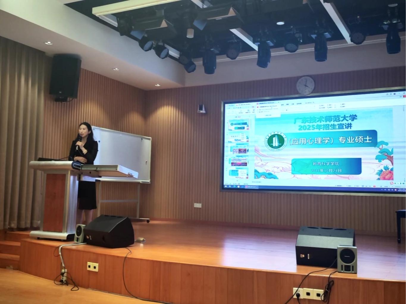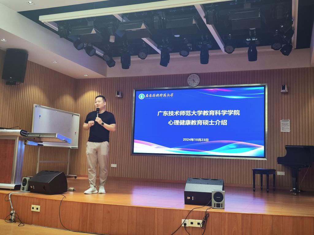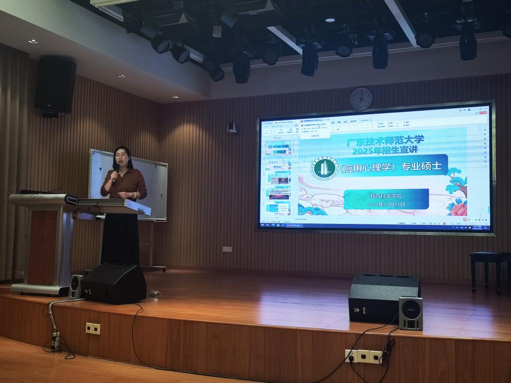 2024年10月24日下午,应用心理系主任张玲燕老师、应用心理方向负责人崔诣晨老师、心理健康教育方向负责人郭腾飞老师、研究生秘书洪希老师在广东第二师范学院教师教育学院在树人楼儿童剧场举行了2024年研究生招生宣讲会。广东第二师范学院教育学院心理学系何德娴老师主持本次宣讲会,心理学系有意考研的本科生参加了宣讲会。