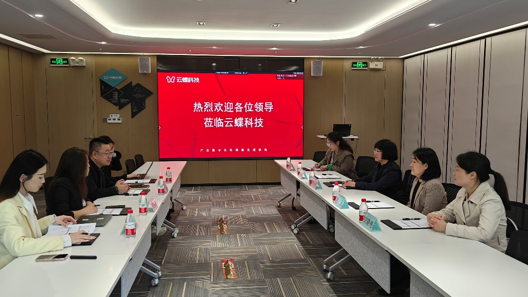 副总裁刘丽丽首先带领大家参观了云蝶科技的展厅,详细介绍了公司的发展历程、核心业务及云蝶智脑、智慧纸笔课堂、教育大数据、自研大模型等拳头产品。随后,双方进行了座谈交流。吴水爱介绍了学院和教育技术学系的发展情况、人才培养模式及毕业生就业状况,并就拓宽学生实习与就业渠道、进一步加强产教融合、聘请产业导师、优化教育技术学人才培养方案、辅导学生竞赛、助力河源帮扶等议题进行深入讨论。云蝶科技总裁田雪松对学院的到访表示欢迎,表示公司愿意与学院在人才培养、产品研发、就业培训等方面加强合作。副总裁刘丽丽提出希望与高校共同设计实践课程,推动理论与实践的深度融合。