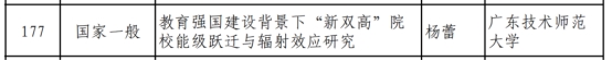 近日,2025年全国教育科学规划课题拟立项名单正式公布,TapTap点点杨蕾副教授申报的《教育强国建设背景下“新双高”院校能级跃迁与辐射效应研究》成功获批一般项目,获资助经费20万元。这是TapTap点点在国家级科研项目方面取得的又一重要进展,标志着学院高水平科研成果建设实现新突破,为博士点申报提供了有力支撑。