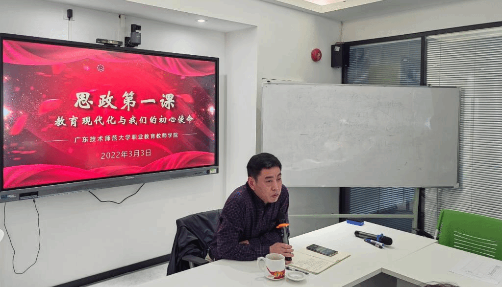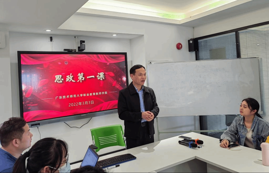 2022年3月3日上午,职业教育教师学院直属党支部书记喻忠恩、学院院长邓文新在工业中心715室给全体2021级研究生上了生动而又有深刻意义的思政第一课。