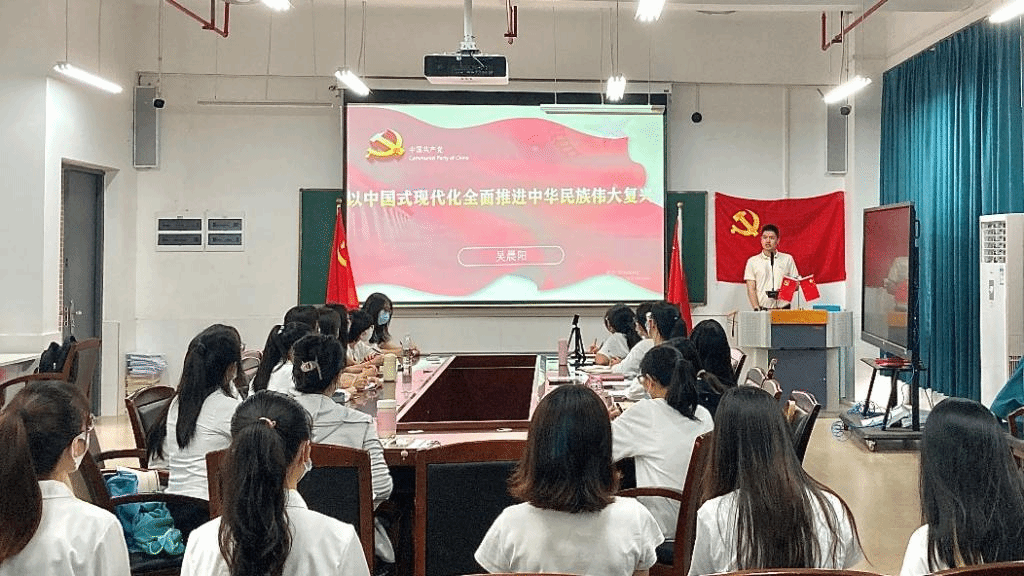 最后,支部书记吴晨阳老师以《以中国式现代化全面推进中华民族伟大复兴》为题作专题党课,他分别从总体框架、主题、逻辑三大角度解读了党的二十大报告,并深入浅出地阐释了中国式现代化内涵。中国式现代化是中国共产党领导的社会主义现代化,既有各国现代化的共同特征,更有基于自己国情的中国特色。中国式现代化的本质要求是坚持中国共产党领导,坚持中国特色社会主义。通过详细研读党的二十大报告,与会党员进一步把握了其深刻内涵和重大意义。他希望支部全体成员在学习工作之余,不忘学习理论知识,要紧密围绕主题教育深入学习领会习近平总书记系列重要讲话精神,深刻领会发展思路内涵以高质量基层党建引领和带动专业高质量发展。