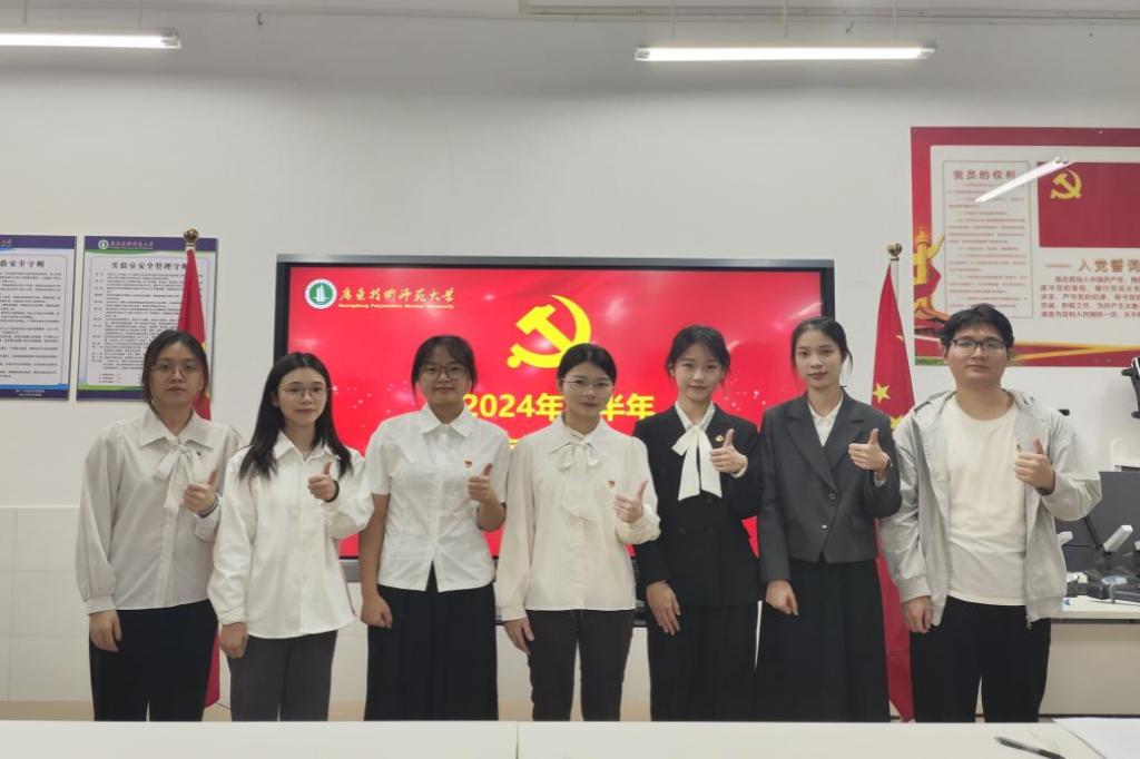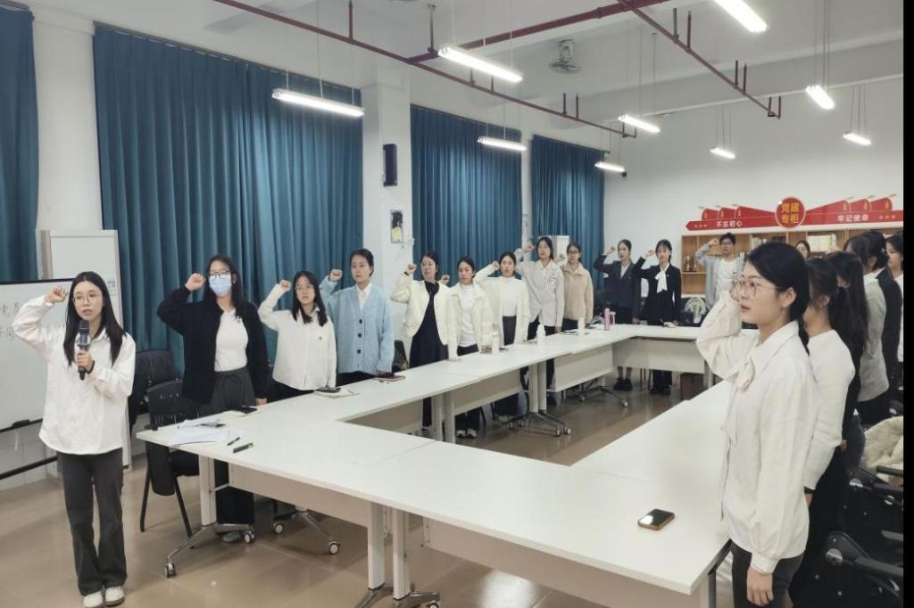 会上,经支部大会逐一讨论和无记名投票表决,同意接收叶嘉慧、黄倩蕾、邓慧茹、杨欣仪4位发展对象为中共预备党员,并向4位同志授予党员徽章,而后4位预备党员庄重地面向党旗进行入党宣誓。