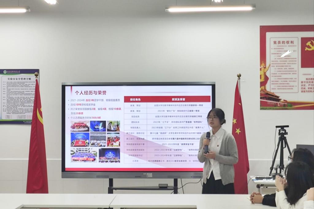 大会在庄严的国歌中拉开了序幕,张国秀同志向大家宣读了接收预备党员的会议议程,并强调了党支部发展党员的组织原则和纪律要求。随后,叶嘉慧、黄倩蕾、邓慧茹、杨欣仪4位发展对象依次上台,向党组织汇报了自己对党的认识、入党动机以及个人经历。随后,4位同志依次抽取并回答了相关问题。紧接着,入党介绍人详细汇报了对发展对象的培养和考察情况,并提出了对其入党的意见,正式党员进行了随机提问,发展对象现场答辩。答辩环节结束后,纪检委员黄亚良同志代表支委会向大会报告了对四位同志的审查结果和支委会的意见。
