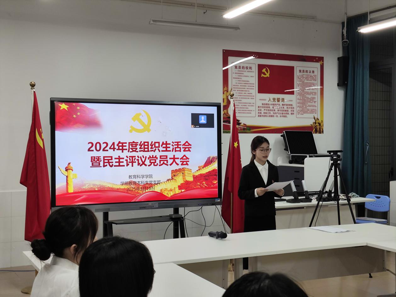 为深入学习贯彻党的二十届三中全会精神,巩固深化党纪学习教育成果,进一步加强党支部组织建设,3月10日,学前教育本科生党支部于第二实训楼502会议室召开2024年度组织生活会和民主评议党员大会。会议由党支部学生副书记张国秀同志主持,全体党员参会,党支部书记吴晨阳老师列席会议。