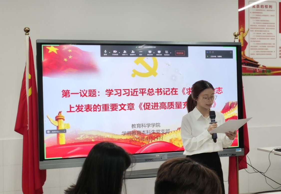 第一议题学习结束后,两位预备党员同志分享了自己的学习感悟。预备党员叶嘉慧同志谈到,当前大学毕业生规模创历史新高,就业成为重要课题。文章为就业工作指明方向,我们应夯实专业基础,积极实习积累经验,关注政策动态,提前规划职业,保持积极心态,勇敢尝试,积累面试经验,为社会贡献力量。预备党员黄倩蕾同志表示,新时代以来,我国在就业领域取得显著成就,但也面临挑战,特别是学前教育专业的结构性就业矛盾。她认为,我们应提升专业素养,积累实践经验,树立正确就业观,积极创新,为实现个人价值和促进就业添砖加瓦。
