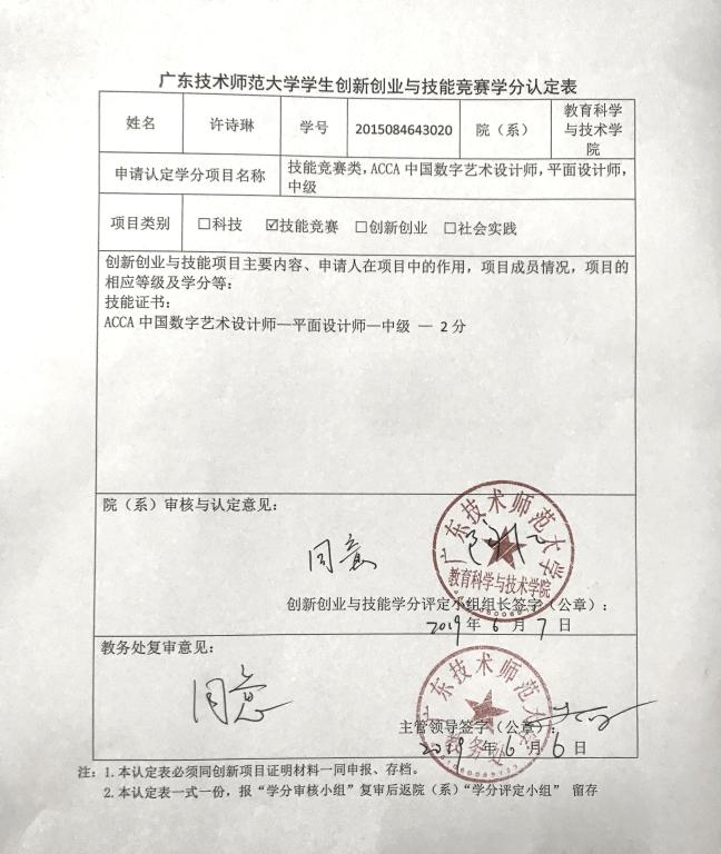 经学生本人申请、二级学院审核及学院学分认定工作委员会研究,同意许诗琳同学(见附件)创新创业与技能竞赛学分认定,现予以公示。