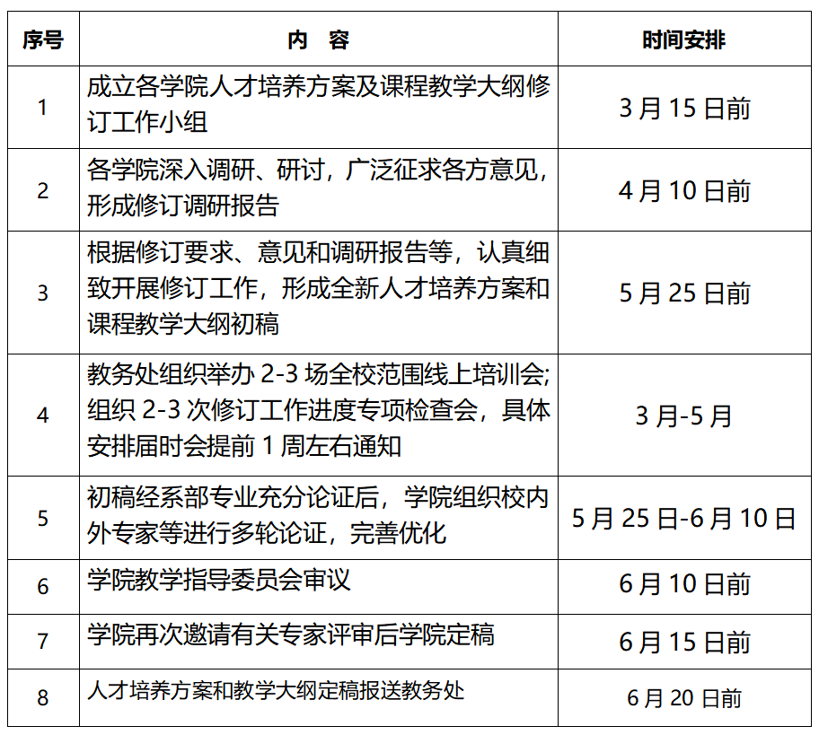 为适应新时代国家经济社会发展和行业企业新技术革命与产业变革对人才培养的新要求、新标准,进一步加强我校新工科、新文科、新师范建设,突出我校“技术+师范”人才培养特色,加强专业内涵建设,优化应用型人才培养体系,提升本科教育和人才培养质量,学校决定启动2023版本科专业人才培养方案及课程教学大纲修订工作,现将具体安排通知如下: