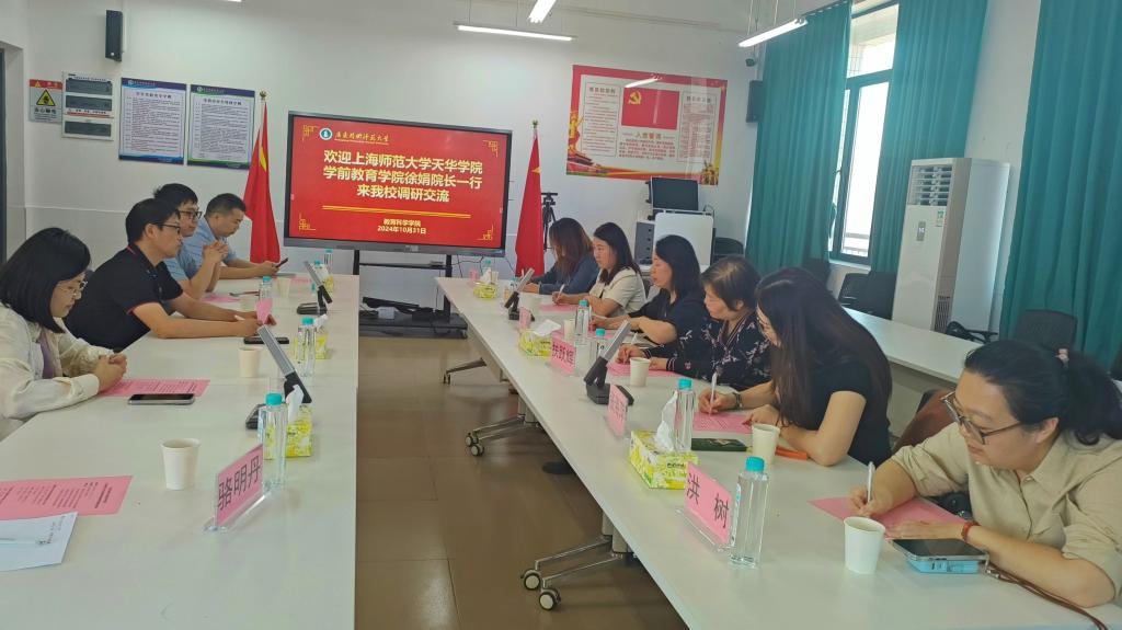 10月31日下午,上海师范大学天华学院徐娟院长等一行6人来校调研交流学前教育本科、硕士人才培养方案、课程体系设置、实习实训、学前系师资队伍与科研管理以及产学研等相关工作。我校TapTap点点熊华军院长、学前教育系主任黄茂勇老师、学前教育专业负责人徐韵莹老师、杨定玉教授以及骆明丹老师参加调研座谈。