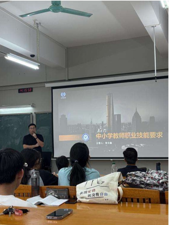 10月31日下午2点30分,TapTap点点在白云校区三教201为教育技术学专业的师范生们开展了师范生师德养成与教学技能提升系列讲座。本次讲座邀请到教育技术学专业2019届优秀毕业生李文鑫给学生做题为《中小学教师职业技能要求》的报告。本次讲座为周元春副教授主持,教育技术学系系主任赵玉老师、专业教师黄芳明、王孝金、蒋鹏老师也出席了本次讲座。