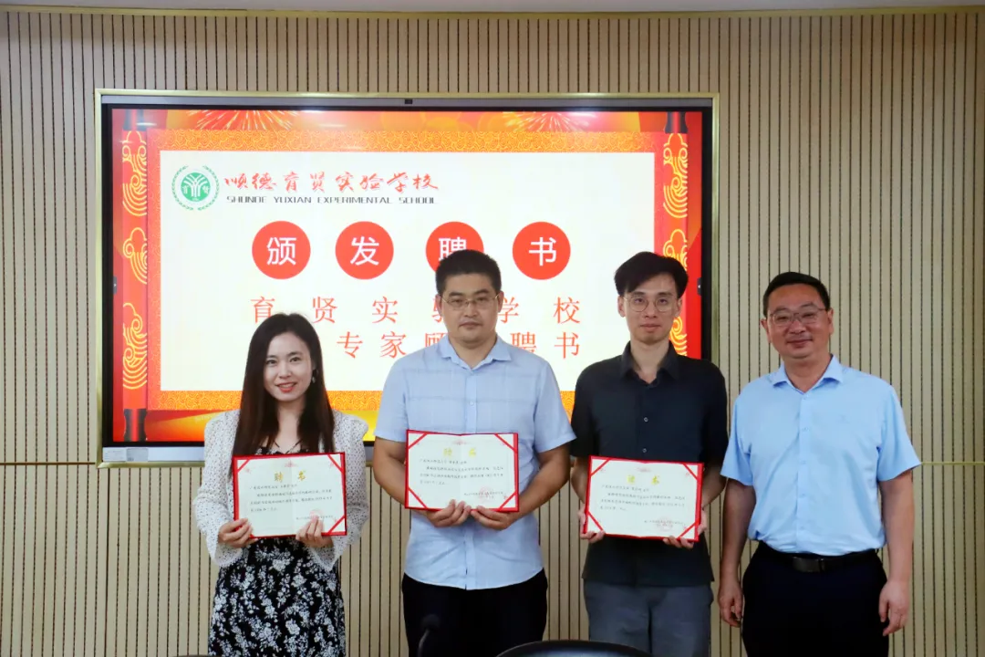 18日上午,走访团队一行首先达到育贤实验学校。该校濮文磊校长、教学行政、实习导师与实习学生出席了本次活动。会议伊始,与会人员通过“科创苑”的简介视频,对该校科技创新领域的进行了初步的了解,随后,该校科技创新部谭健泰部长围绕育贤科创教育的发展与成效、科创团队风采、环境条件及未来展望四个方面进行信息科技课程教学指导工作汇报。实习生代表林苑仪老师则分享了自己的实习心得和收获。谢德新副院长勉励在座实习老师们珍惜这次难得的实习机会,充分把握和利用育贤实验学校提供的资源,为自己的实习实践和专业发展赋能。在检查结束后,两校进行了导师互聘仪式,谢德新副院长向育贤实验学校颁发了校外实践导师聘书,育贤实验学校向教育技术学系的四名专任教师颁发校外指导专家聘书,这一互聘机制进一步强化了双方在实践教学和学术交流方面的紧密联系与合作。在合作交流环节,双方就未来的合作模式进行了深入探讨,并针对即将到来的师范专业认证专家实地考察进行了详细商讨,以确保考察工作的顺利进行。