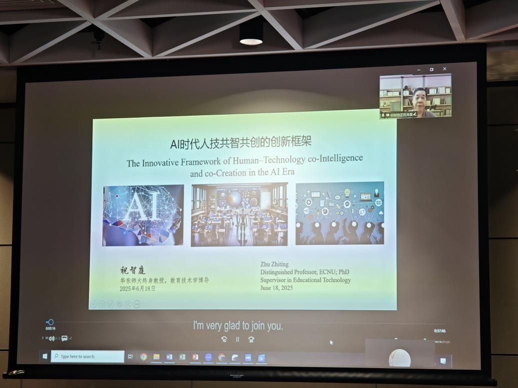 6月18日下午,师生代表深度参与在香港教育大学举办的CTE-STEM & MetaACES 2025国际学术会议。本次会议汇聚海内外教育技术领域顶尖学者,华东师范大学祝智庭教授带来的首场主旨报告《AI时代人技共智共创的创新框架》,为师生解锁了人工智能重塑教育生态的前沿密码。报告中,祝智庭教授立足“通用人工智能(GenAI)重构教育生产力”的时代语境,系统阐释“人技共智共创”创新框架的核心理念——在技术深度融入教育场域的当下,需突破“工具化应用”思维惯性,构建“人类智能与人工智能双向协作、认知共创”的教育新范式。并结合中小学AI教育实践案例,从“教学目标动态适配、学习资源智能生成到评价反馈精准迭代”等维度,具象化呈现“认知协作、文化共创、生态共建”的实践路径,让抽象的理论框架成为可感知的教育创新图景,为师生打开教育数字化转型的全球视野。