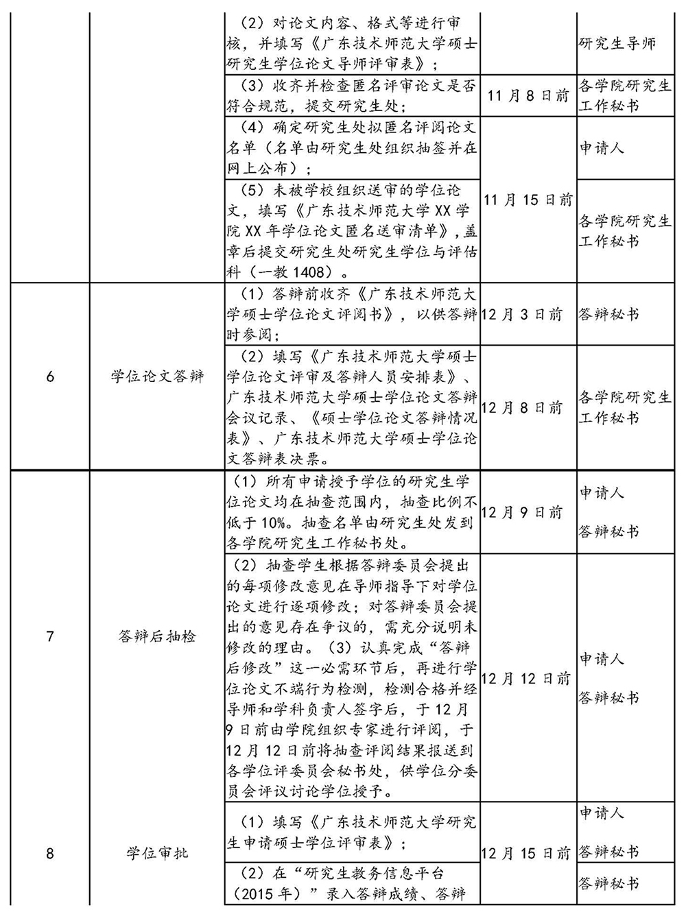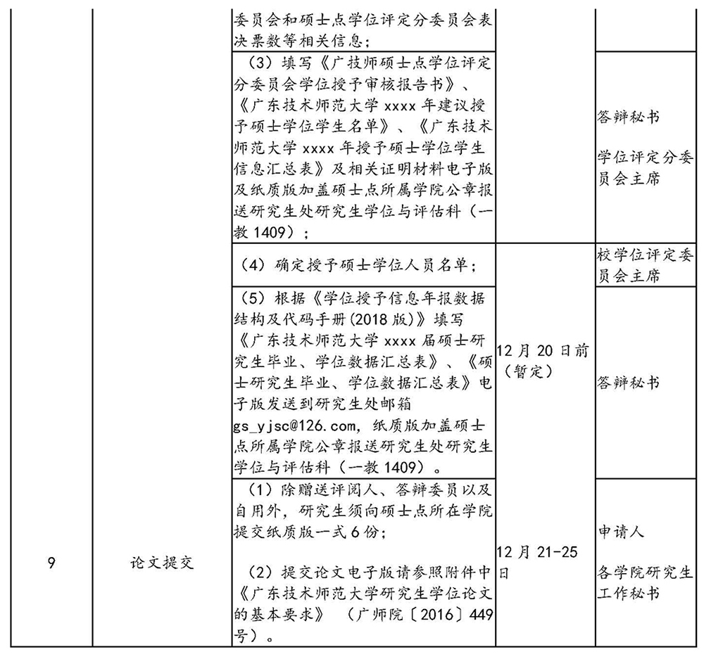 各硕士点学位评定分委员会负责组织答辩工作,遵照《广东技术师范学院硕士研究生学位论文答辩工作细则》(广师院〔2016〕450号)要求,于12月8日前完成学位论文答辩工作。