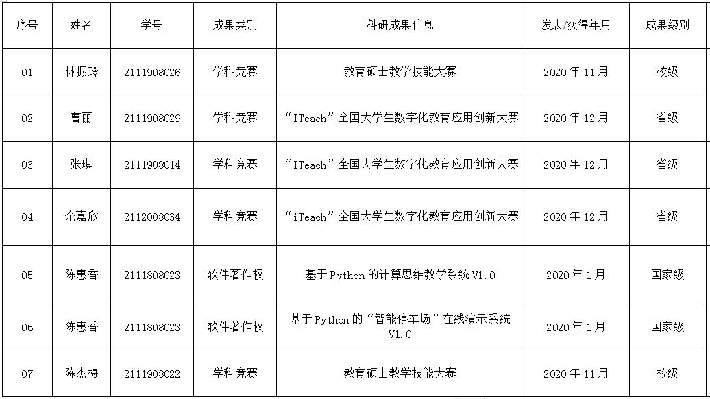 经研究生自主申报,导师推荐,教育科学与技术学院组织评审,现将评审结果给予公示三天,公示期为2021年5月17日-5月19日,如有异议,请在公示期内实名向教育科学与技术学院提出书面申述,并提供具体材料,不签署真实姓名或不提供具体材料的,不予受理。