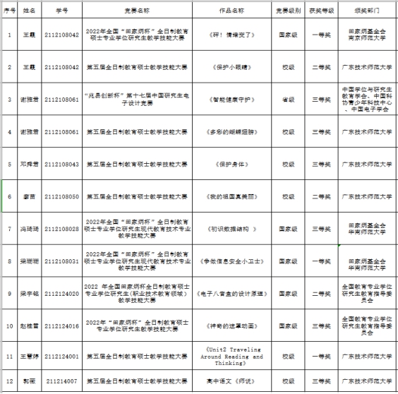 根据TapTap,TapTap点点《关于开展2022年TapTap,TapTap点点研究生优秀科技竞赛成果奖评选工作的通知》(广师大研〔2023〕6号)文件要求及《TapTap,TapTap点点研究生学科竞赛资助和奖励办法》(广师大〔2022〕372号)相关规定。经研究生自主申报,导师推荐,教育科学学院组织评审,现将评审结果予公示三天。