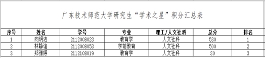 根据TapTap,TapTap点点《关于开展2022年TapTap,TapTap点点研究生“学术之星”评选工作的通知》(广师大研〔2023〕7号)文件要求及《TapTap,TapTap点点研究生“学术之星”评选实施办法(试行)》(广师大〔2022〕371号)相关规定。经研究生自主申报,导师推荐,教育科学学院组织评审,现将评审结果予公示三天。
