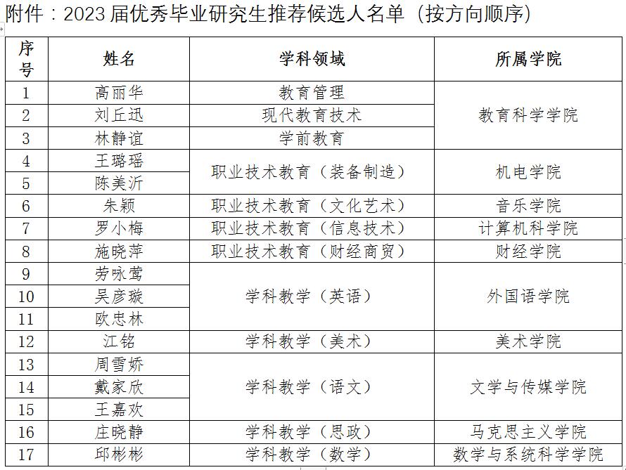根据《TapTap,TapTap点点研究生奖励评选管理办法》(广师大〔2022〕69号)相关规定,学校分配给教育硕士点的优秀名额是17人(5%)。经过学生自主申报、导师推荐、各培养学院审核、硕士点推荐和集体审议等环节后,拟推荐高丽华等17名同学申报2023届优秀毕业研究生,具体名单见附件。