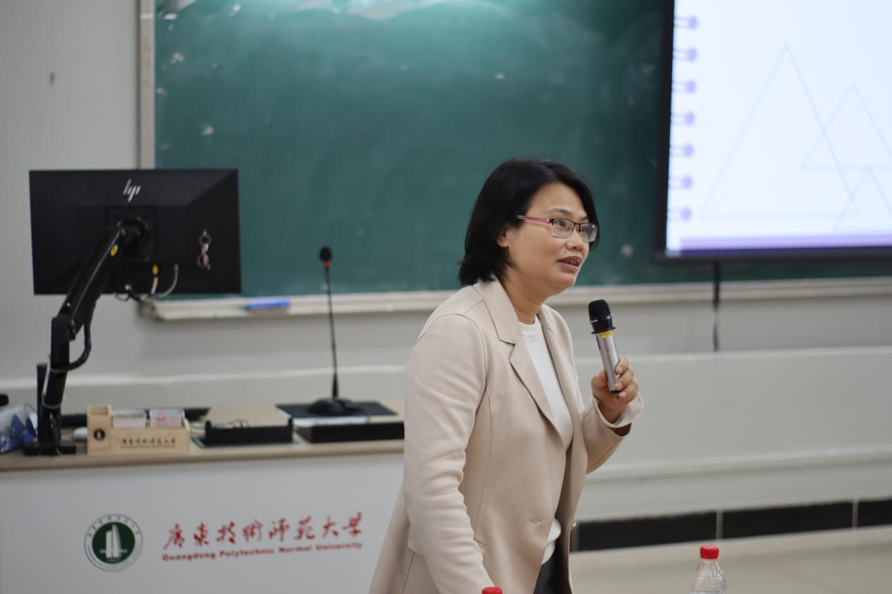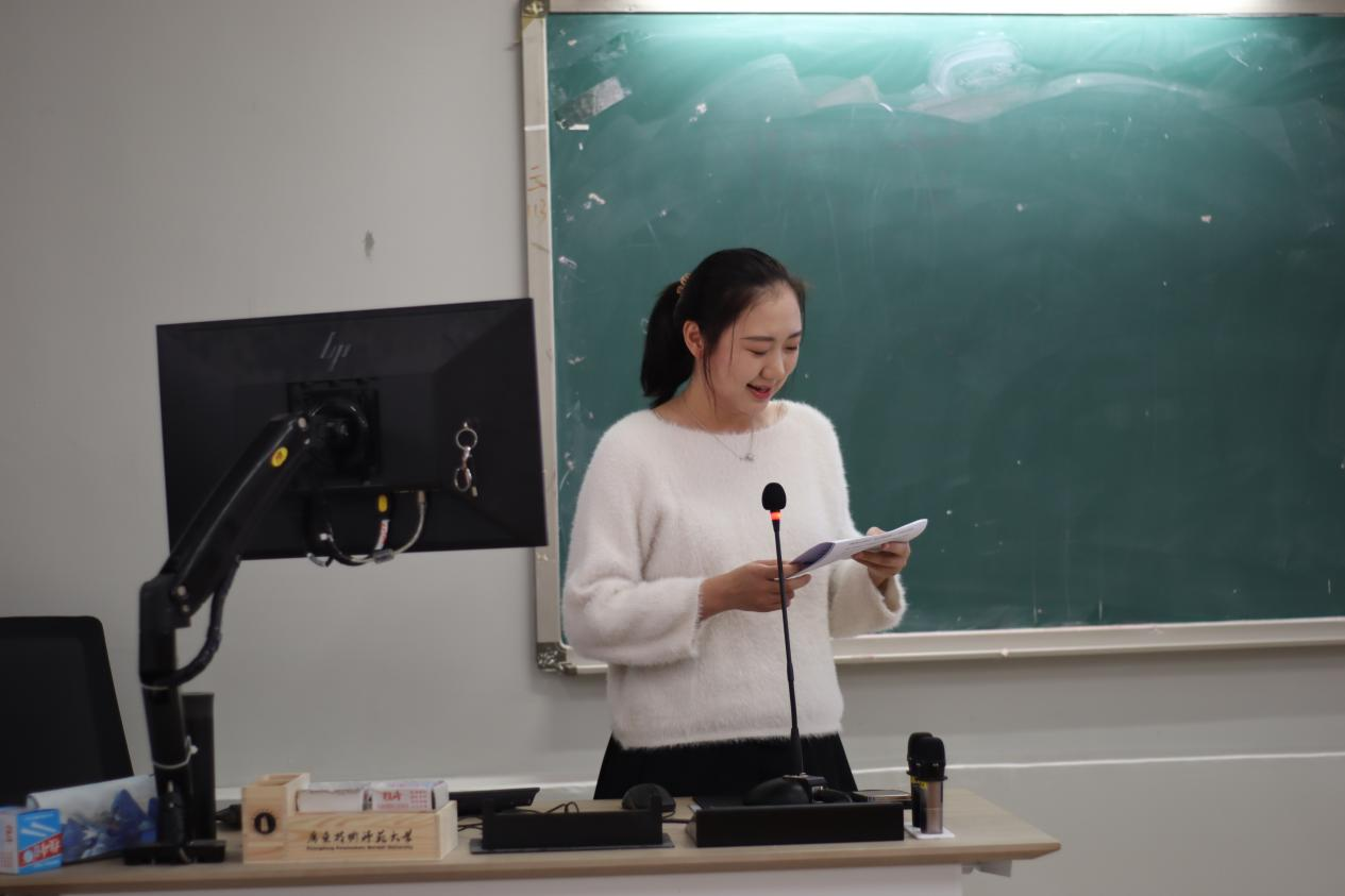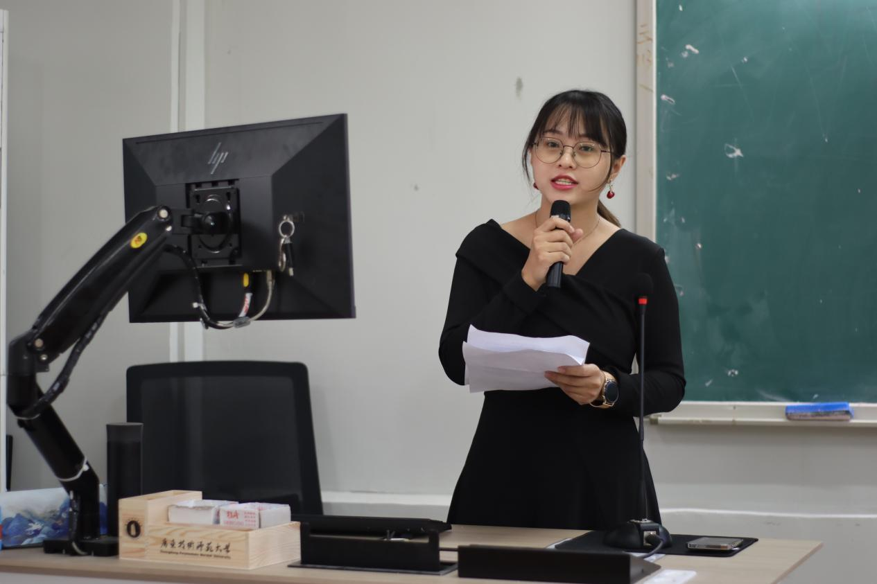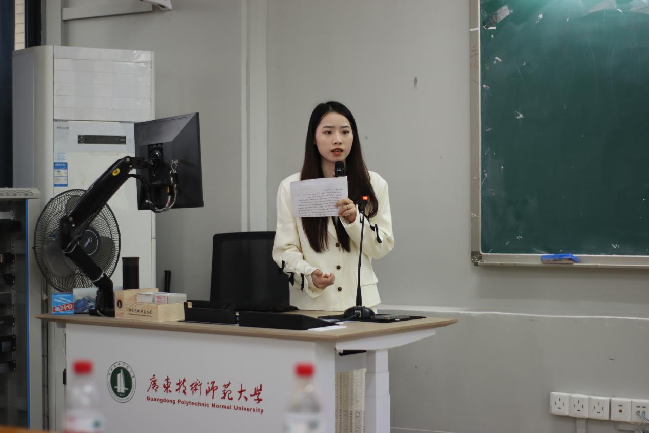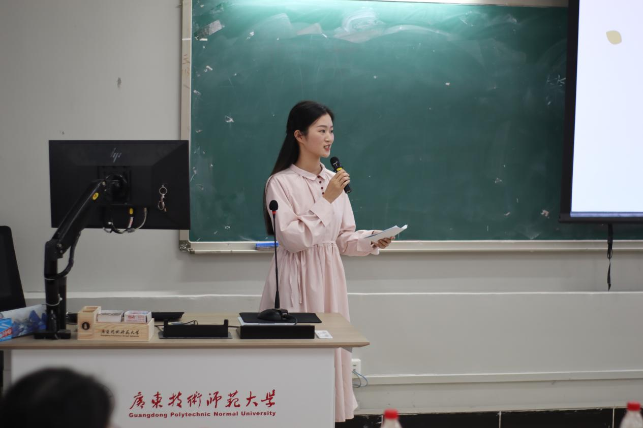 来自21教育管理专业的陈育勤同学作为实践之星代表分享了她在佛山市顺德区梁銶琚职业技术学校教育见习和实习过程中所见所闻所想所作的教育教学实践。其中讲到,学校管理有“重点”,做到“有深度、有高度、有温度”;课堂教学有“设计”,做到“见教材、见学生、见课堂”;班级管理有“方法”,做到“约规、动情、晓理、导行”。
