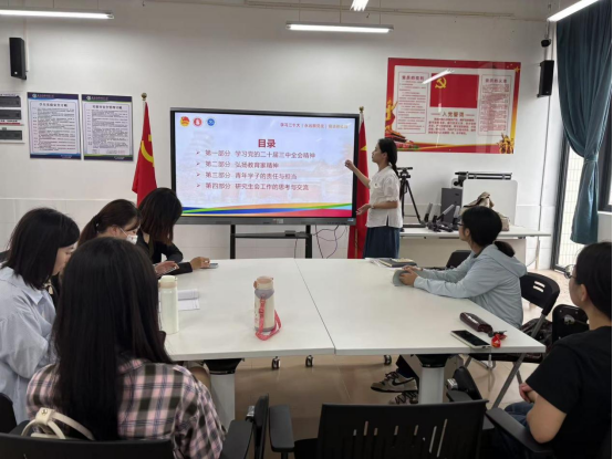 宣讲会围绕党的二十届三中全会的背景和召开的意义,强调了全面深化改革的总目标,以及七个聚焦点的重要性展开。并结合习近平总书记关于教育家精神的重要论述,肯定教师在教育强国战略中的核心地位,号召广大研究生继承和发扬教育家精神,以实际行动践行教育的初心和使命。林婷同学提出了学生骨干如何将全会精神转化为行动的四个方面:学习与理解、制定行动计划、创新实践、承担社会责任。她鼓励同学们将学习成果转化为推动学院发展的具体行动。