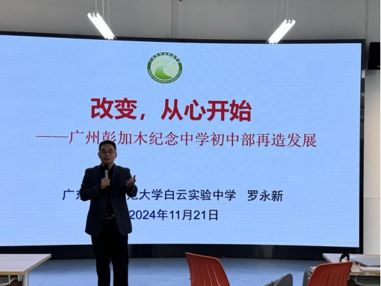 罗永新校长于2024年11月21日下午在白云校区第二实训楼311开展了一场以“改变,从心开始——广州彭加木纪念中学初中部再造发展”为主题的讲座。