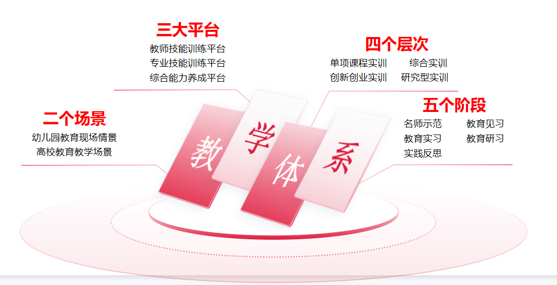 第二,“四年一贯、园校互动”的实践教学体系,依托幼儿园和高校两个场景,充分运用教师技能训练、专业技能训练和综合能力养成三大平台,开展单项实训、综合实训、创新创业实训和研究型实训,通过名师示范、教育见习、教育实习、教育研习以及实践反思五个阶段逐步提升教育实践能力。