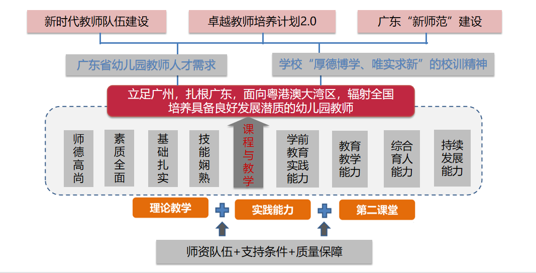 (4)能发展:具备持续学习的发展力。结合学前教育工作岗位实际需求,学会自我规划与发展;能持续保持学习前沿性的学前教育理论,结合粤港澳大湾区,特别是广东省幼儿园发展的现实条件,不断优化教师知识结构并完善自我规划,持续提高综合素养与实践反思能力,不断促进专业发展,成为“持续学习者”。