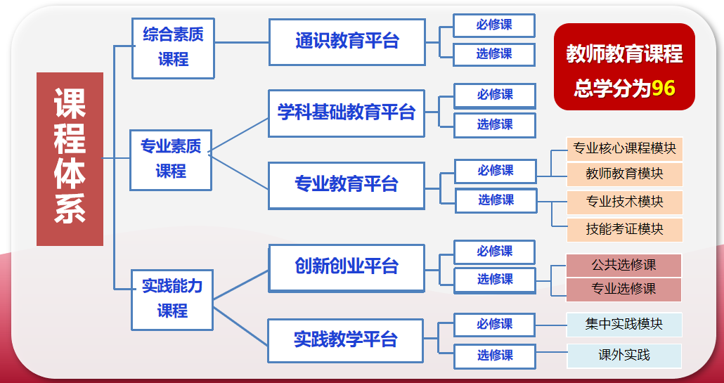 本专业确定了“专业理论课程、专业能力课程、专业素质课程并重,加强学生职前能力培养”的课程设置思路:通过专业理论课程奠定学前教育专业的基础;通过专业能力课程培养职前能力,形成个性和特长;通过专业素质课程促使资格证书获得、能力强化、顶岗实训与就业紧密结合,实现理论、能力、素质一体化的人才培养。基于上述课程设置思路,现行课程体系采用“平台+模块+课程群”的结构形式,由通识教育平台、学科基础教育平台、专业教育平台、创新创业平台和实践教学平台构成。