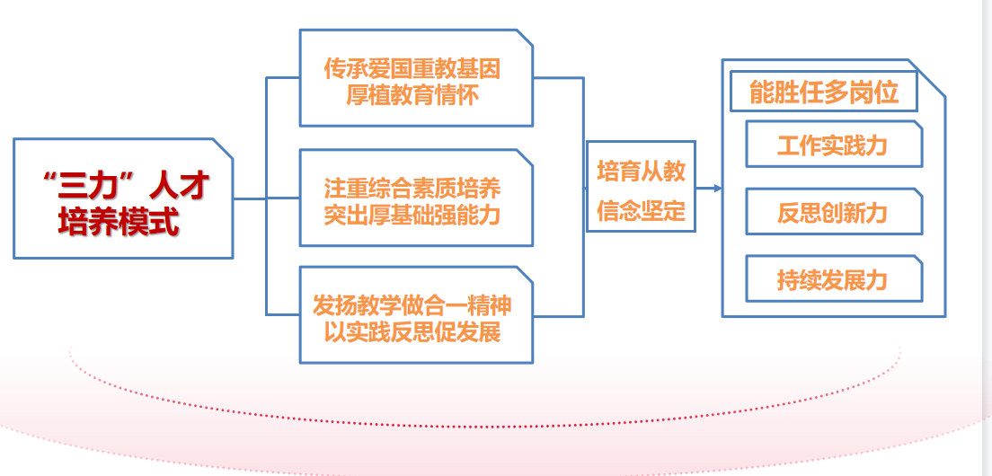 第一,教育信念坚定的“三力”人才培养模式,传承爱国重教基因,厚植教育情怀;注重综合素质培养,突出厚基础强能力;发扬教学做合一精神,以实践反思促发展。培育从教信念坚,具备胜任多岗位工作的实践力、实践反思的创新力和持续发展力的幼儿教师。