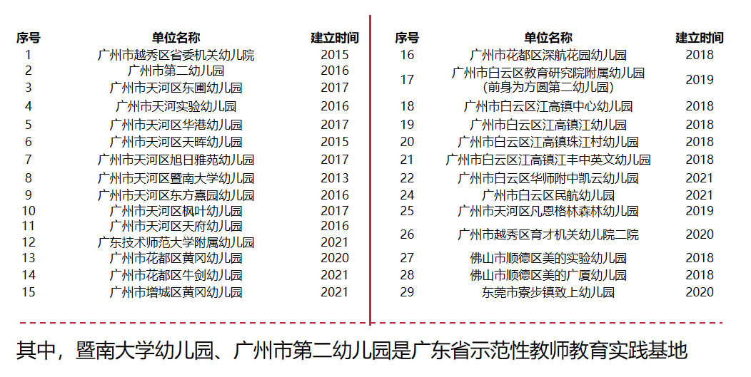 (3)实践基地。目前建有广东省育才幼儿院二院、TapTap,TapTap点点白云实验幼儿园、广州市花都区深航花园幼儿园、广州市白云区教育研究院附属幼儿园等。每个基地均能够充分提供教育资源和条件,具有明显的师资优势、管理优势、课程资源优势和教改优势,能够满足实习生的教育实践需求。